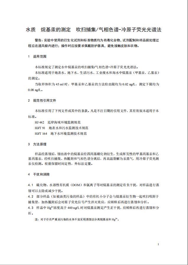 本標(biāo)準(zhǔn)規(guī)定了地表水測定、地下水測定、生活污水檢測、工業(yè)廢水檢測和海水中烷基汞的吹掃捕集/氣相色譜-冷原子熒光光譜法。本標(biāo)準(zhǔn)的附錄A為資料性附錄。 本標(biāo)準(zhǔn)為首次發(fā)布。