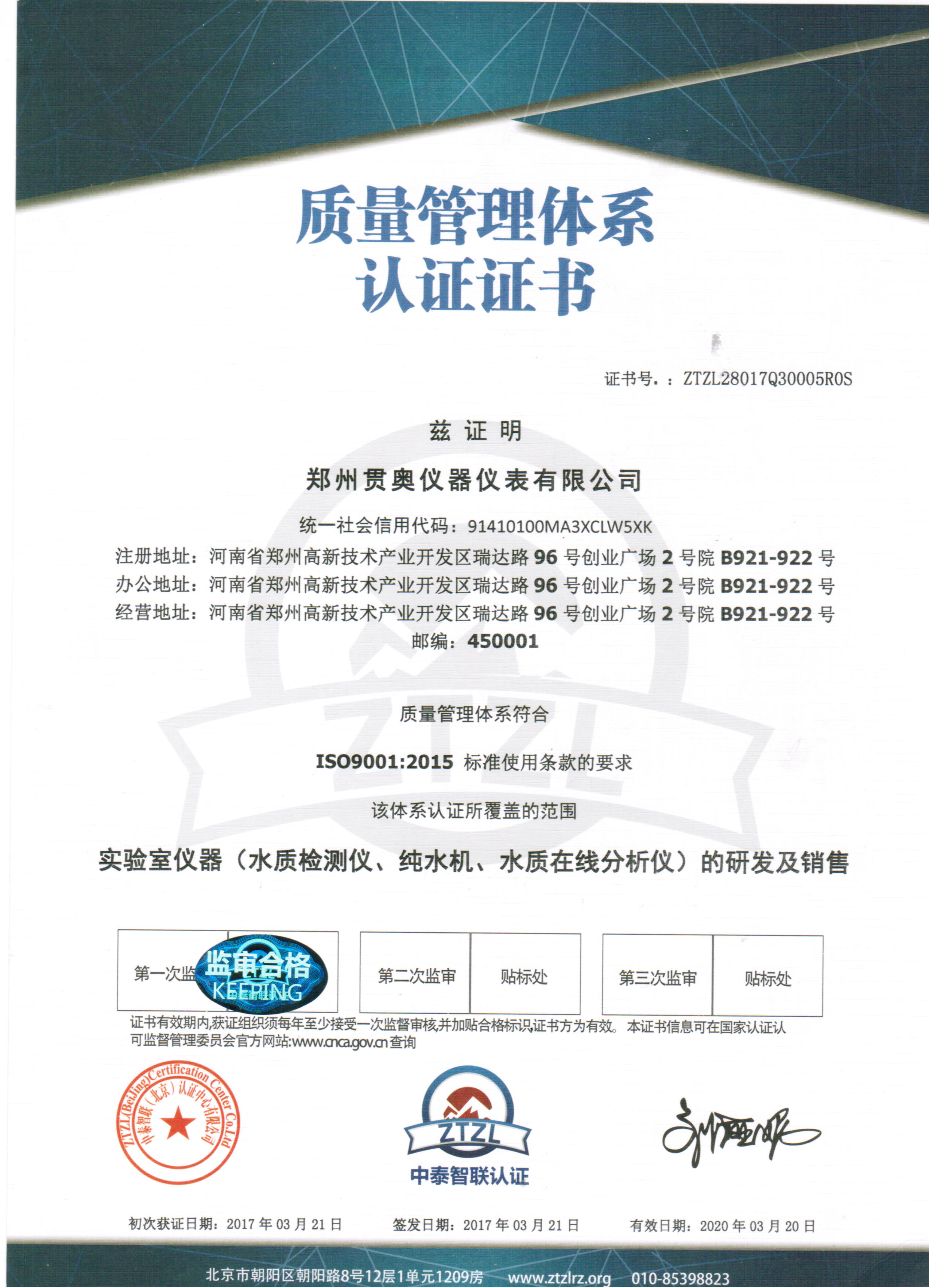 鄭州貫奧儀器儀表有限公司的所有設(shè)備均經(jīng)過省級(jí)計(jì)量院認(rèn)證和檢驗(yàn),貫奧其儀器儀表非常重視知識(shí)產(chǎn)權(quán)的研發(fā)和保護(hù)。公司獲得了"ISO9001:2015"質(zhì)量管理體系認(rèn)證證書,ISO14001:2015環(huán)境管理體系認(rèn)證證書,OHSAS18001:2007職業(yè)健康安全管理體系認(rèn)證證書。鄭州貫奧儀器儀表有限公司企業(yè)信用等級(jí)評(píng)級(jí)"AAA"。