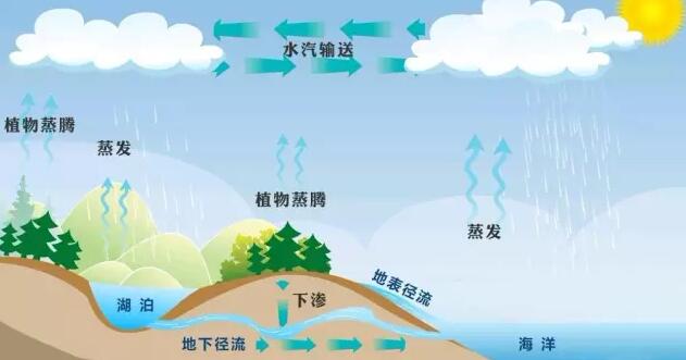 水體是水匯集的場(chǎng)所,按水體所處的位置,可粗略地將其分為地表水、地下水和海洋等三類。它們之間是可以相互轉(zhuǎn)化的。在太陽(yáng)能、地球表面熱能的作用下,通過(guò)水的三態(tài)變化,水在不同水體之間不斷地循環(huán)著。