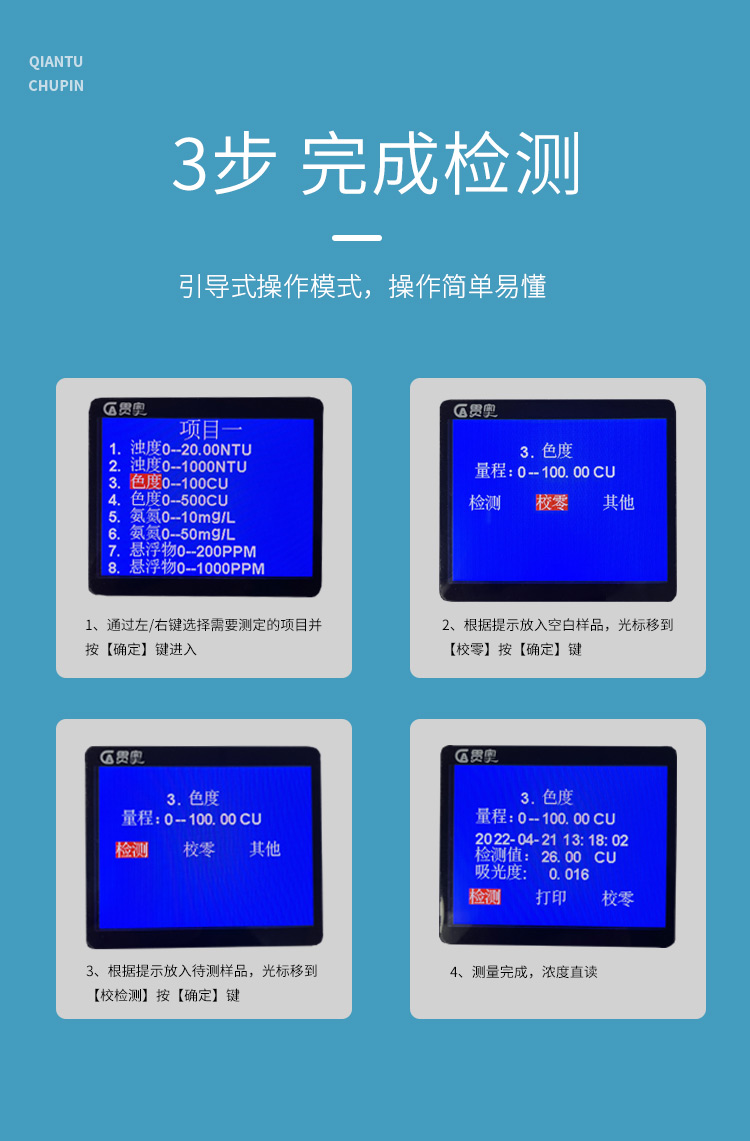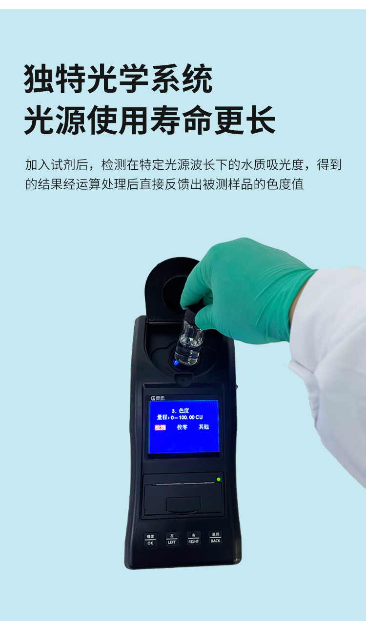 貫奧色度檢測(cè)儀可快速準(zhǔn)確測(cè)定地表水、地下水、城市污水及工業(yè)廢水中色度指標(biāo),濃度直讀;可廣泛用于水廠、食品、化工、冶金、環(huán)保及制藥行業(yè)等部門(mén)。儀器是由單個(gè)的固定波長(zhǎng)固定用途的分光光度計(jì)糅合而成的,采用分光光度法原理對(duì)各參數(shù)進(jìn)行測(cè)量,在儀器中建立不同參數(shù)的濃度顯色程度與吸光度的線性曲線,儀器通過(guò)對(duì)顏色的辨別,得出被測(cè)水樣的濃度。本儀器采用全中文菜單,操作簡(jiǎn)易易懂,使用方便快速測(cè)量準(zhǔn)確度高。